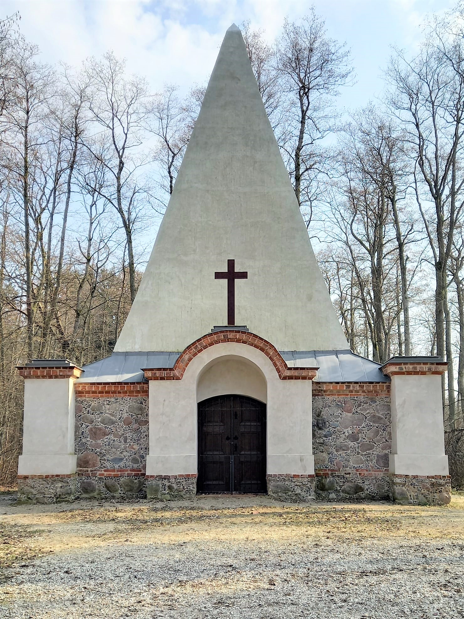 The family house of the Prussian Barons von Fahrenheid was built in 1811. A characteristic feature of the building is its shape, reminiscent of the ancient pyramids. The structure has an inner vault inclined at 51°52’ – identical to that of the Egyptian pyramids. The foundation is built of fieldstone, on a square plan with external dimensions -height: 15.9 m, length of foundation side: 10,4 m. Over the years, seven family members have been buried in the tomb. Long forgotten, the building began to deteriorate. In 2018, the pyramid was restored to its former glory thanks to the efforts of Nadleśnictwo Czerwony Dwór [the Red Manor Forestry District], on whose grounds the chapel is located.