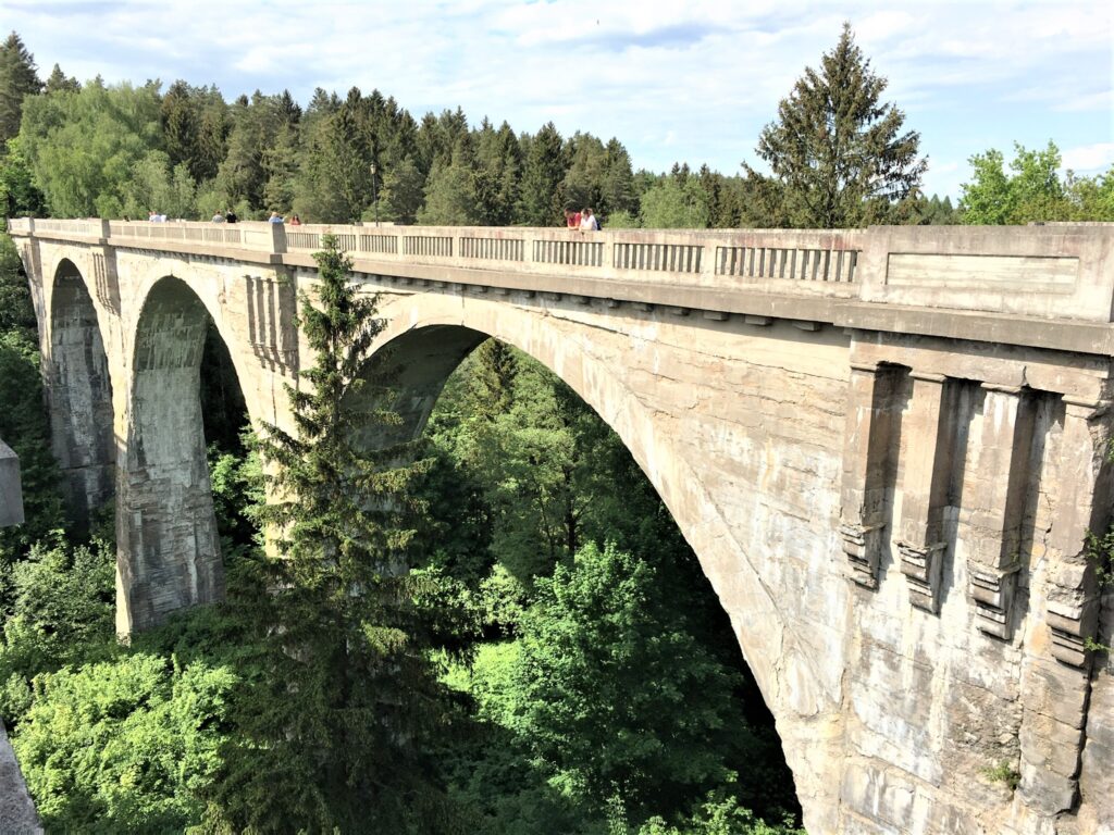 Two huge viaducts from the years 1917-1918 of the disused railway line Gołdap – Żytkiejmy are among the highest in Poland. The construction used a 5-span structure with equal 15 metre high arches, with a length of 180 and a height of up to 36.5 metres. A riverBłędzianka flows under the structures. The architecture is characterised by perfect proportions and the pillars are decorated with elements inspired by the Roman aqueducts at Pont du Gard. Nearby, there is a 20 m highobservation tower with a viewing terrace at the level of 15 m. It offers a view of the Dobellus Duży and Mały extrusion lakes, the historic railway bridges in Stańczyki, and the postglacial valley of Błędzianka. The Green Velo cycling route runs directly by the tower.