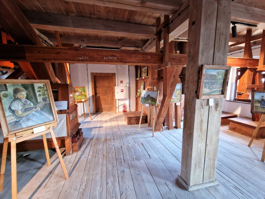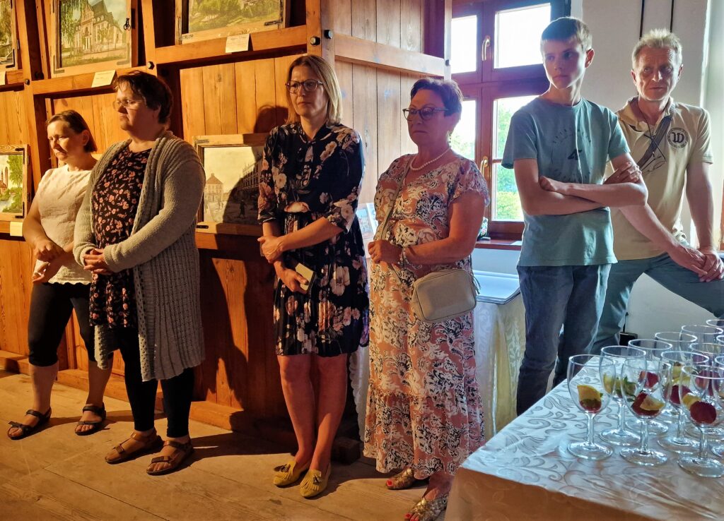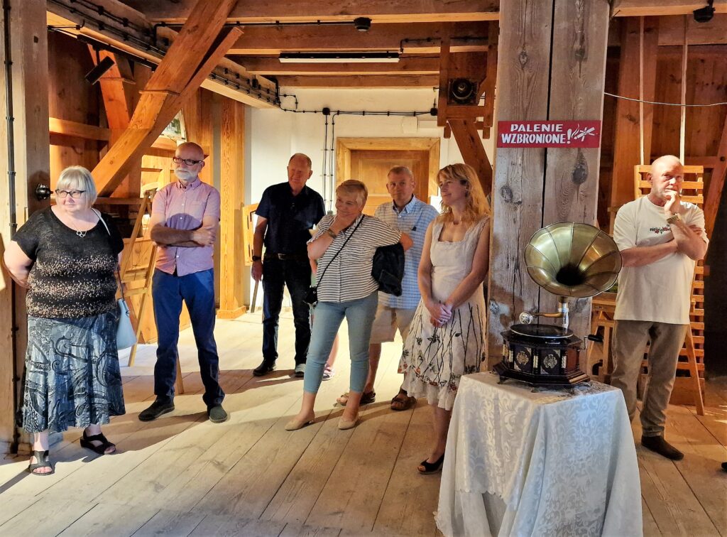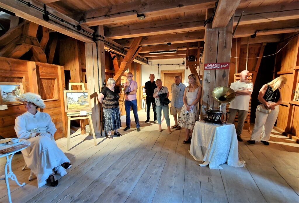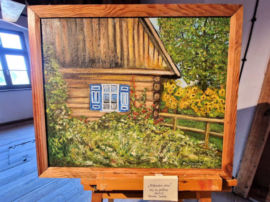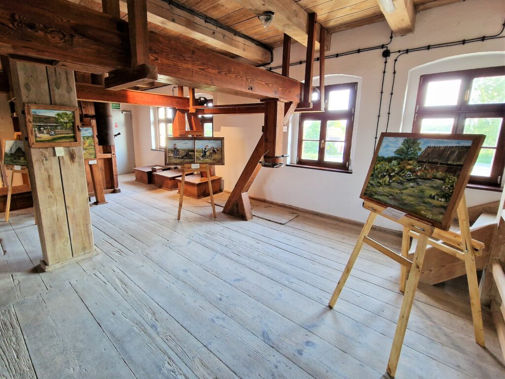 Prace wyeksponowane w zabytkowym młynie prezentowały się fantastycznie. Można było odnieść wrażenie, że znajdują się tutaj od zawsze. Wśród wszystkich pięknych prac perełką jest obraz z wizerunkiem naszego młyna. Tym bardziej jest on dla nas cenny, gdyż został namalowany w autentycznym, starym oknie z naszego młyna.